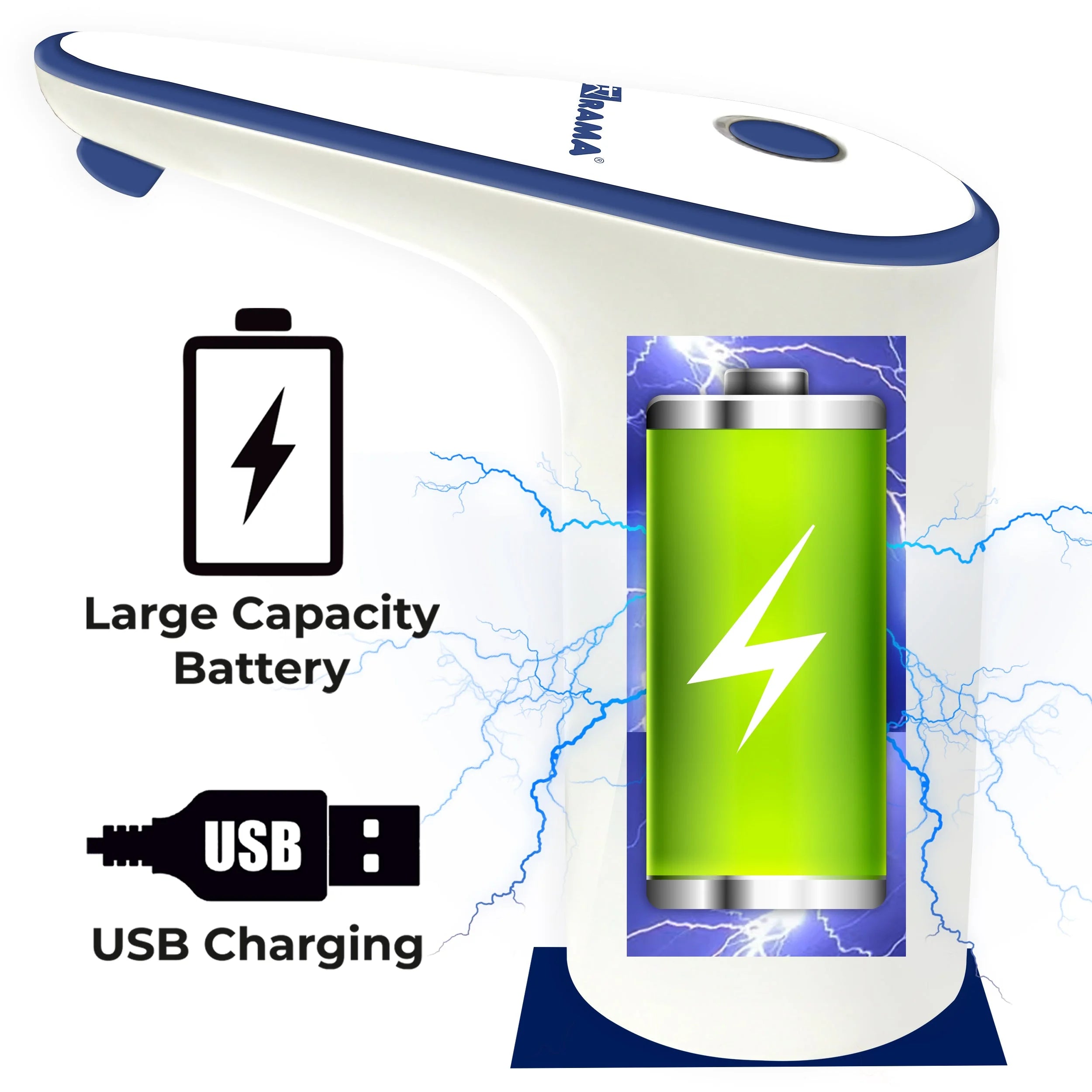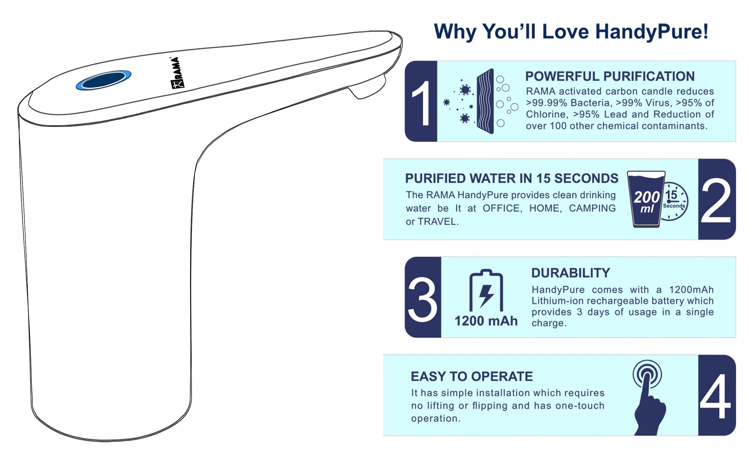रामा हैंडीप्योर वॉटर डिस्पेंसर में पानी के डिब्बे के लिए 4 इंच की 1 कार्बन कैंडल शामिल है, 1200 एमएएच बैटरी के साथ आता है जो एक बार चार्ज करने पर 3 दिनों का उपयोग प्रदान करता है, 60 सेकंड में ऑटो स्टॉप, सफेद रंग
